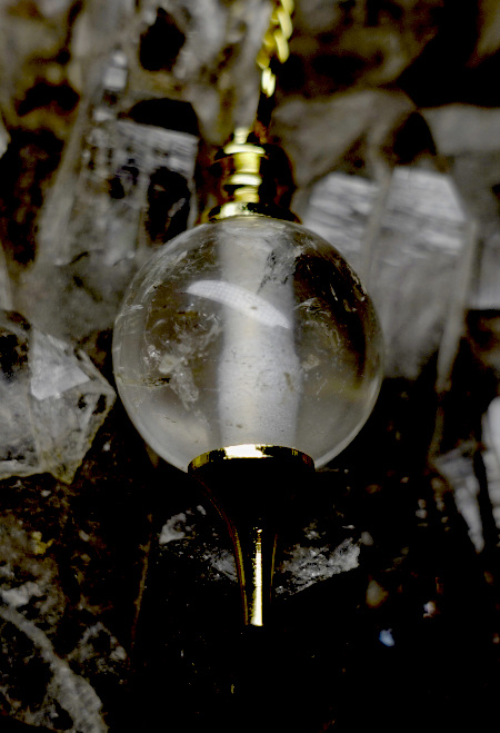 Dieses Kugelpendel ist mit schneeartigen Nebel erfüllt durch das das Licht zart hindurchscheint. Der verwendete Bergkristall ist jedoch nicht okpak sondern von leicht durchscheinender Transparenz. | |